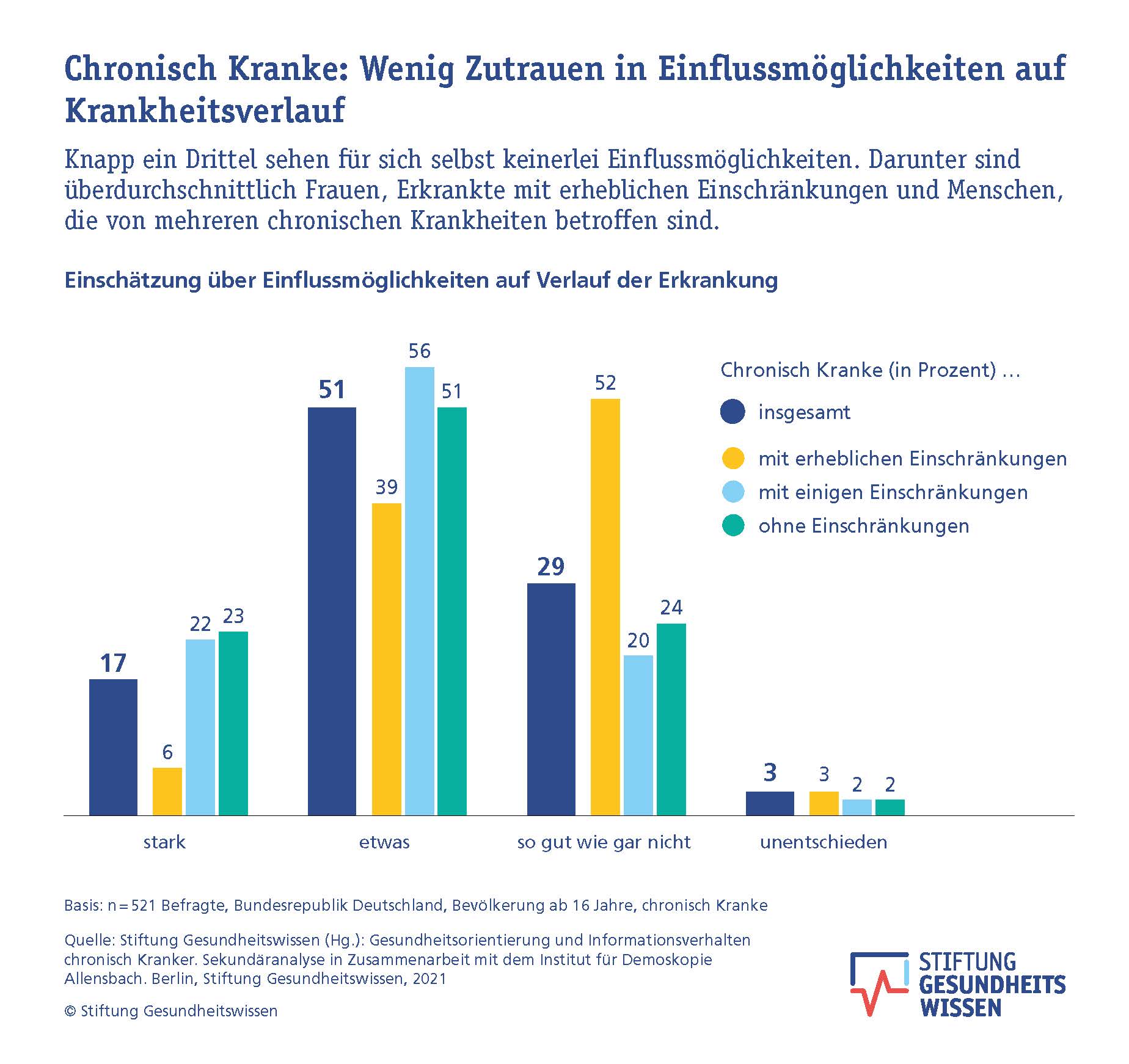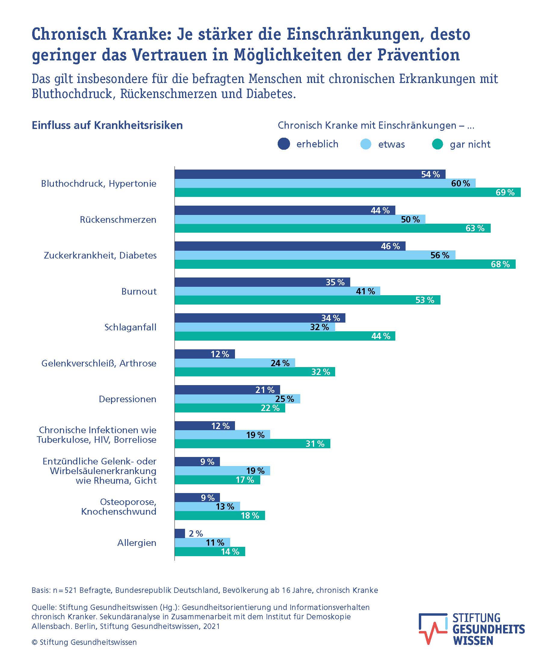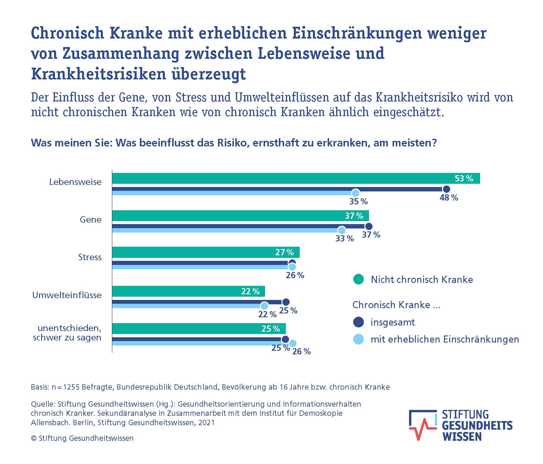 Zusammen mit dem Institut für Demoskopie Allensbach hat die Stiftung in einer Umfrage den Blick speziell auf Menschen mit chronischen Erkrankungen gerichtet. Untersucht wurden unter anderem die Einschätzung der eigenen Selbstwirksamkeit und das Präventionsverhalten der Erkrankten. Die Studie zeigt, dass Menschen mit chronischen Erkrankungen zwar eine klare Vorstellung davon haben, was einen gesunden Lebensstil ausmacht und sie fühlen sich auch insgesamt gut informiert, aber nur 17% der Studienteilnehmenden glauben daran, mit ihrem Verhalten den eigenen Gesundheitszustand beeinflussen zu können. 29% der befragten chronisch Kranken sind sogar eher fatalistisch gestimmt und sehen für sich selbst keinerlei Einflussmöglichkeiten auf den Verlauf einer Erkrankung. Zu diesen Menschen zählen überdurchschnittlich Frauen, Erkrankte mit erheblichen Einschränkungen und chronisch Kranke, die von mehreren Krankheiten betroffen sind.