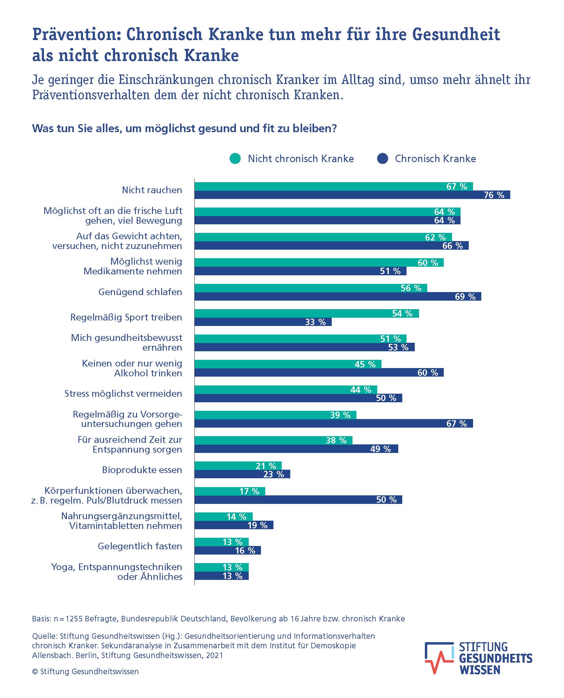 Chronisch Erkrankte bzw. Menschen mit dauerhaften gesundheitlichen Beeinträchtigungen geben an, Probleme zu haben, ihre Krankheit und die Auswirkungen kontrollieren zu können (28% der Befragten). Sie schreiben sich selbst nur wenig Einflussmöglichkeiten auf den weiteren Verlauf der Erkrankung zu. 51% geben an, «etwas Einfluss» zu haben, 29% so gut wie keinen. Dieser Eindruck verstärkt sich mit dem Grad der Einschränkungen im Alltag: 52% der Menschen mit erheblichen Einschränkungen schätzen ihre Einflussmöglichkeiten als sehr gering ein. Die Mehrheit der Befragten mit einer chronischen Erkrankung ist zwar der Meinung, dass die Möglichkeit besteht, die Krankheit mit Vorsorgemassnahmen zu verhindern oder zumindest die Krankheit und ihre Folgen abzuschwächen, aber je stärker sich die Menschen durch ihre Erkrankung eingeschränkt fühlen, desto mehr schwindet das Vertrauen in Präventionsmöglichkeiten (am Beispiel Diabetes ohne Einschränkungen: 68%, mit Einschränkungen: 46%). Die Vorstellungen der befragten chronisch Kranken, was ein gesundheitsorientiertes Leben ausmacht, sind recht konkret. Als besonders wichtig gelten der Verzicht auf Rauchen (87%), ausreichend Schlaf (85%), möglichst viel Bewegung (83%), die Kontrolle des eigenen Gewichts (77%), die regelmässige Wahrnehmung von Vorsorgeuntersuchungen (77%), eine gesundheitsbewusste Ernährung (72%) und die Vermeidung von Stress (70%). Ähnliche Einschätzungen geben auch die befragten Menschen ohne chronische Erkrankungen an. Die Studienteilnehmenden setzen die genannten Gesundheitsmaximen jedoch unterschiedlich ausgeprägt um: Zum Beispiel geben 39% der nicht chronisch Kranken an, regelmässig Vorsorgeuntersuchungen wahrzunehmen. Bei den chronisch Kranken sind es 67%.