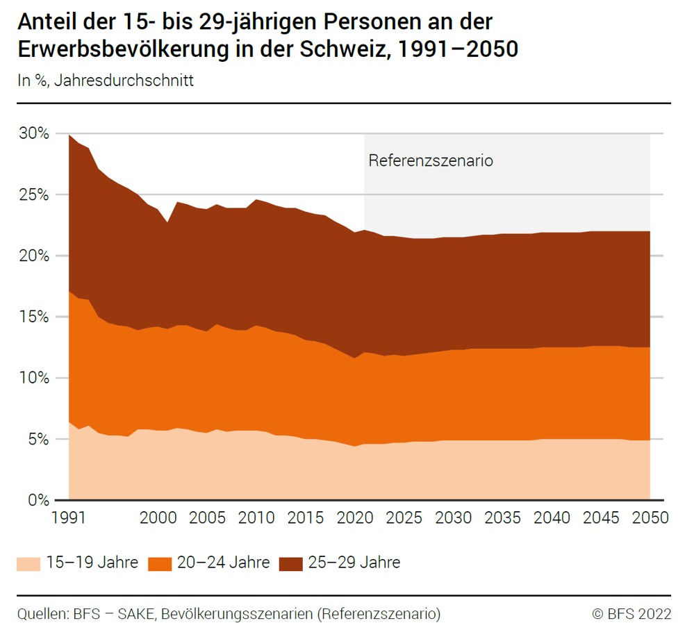 Zwischen 1991 und 2020 ging der Anteil der 15- bis 29-Jährigen an der Erwerbsbevölkerung von 29.9% auf 22.0% zurück. Diese Abnahme erklärt sich hauptsächlich damit, dass die Babyboom-Generation (geboren zwischen 1945 und 1964) in den höheren Altersklassen stärker vertreten ist. Weitere Erklärungsfaktoren sind die immer längere Ausbildungsdauer und die zunehmende Arbeitsmarktteilnahme von Frauen ab 30 Jahren.