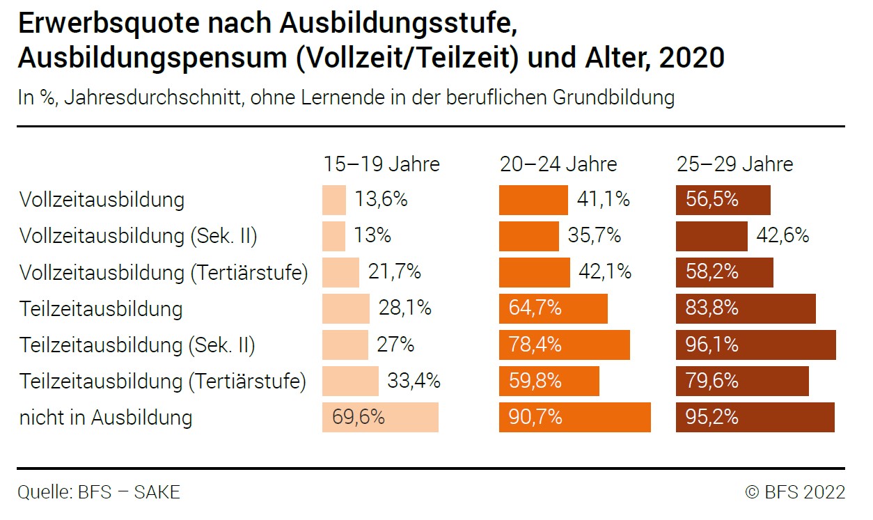 Dies sind einige Ergebnisse aus der Publikation «Personen zwischen 15 und 29 Jahren auf dem Schweizer Arbeitsmarkt im Jahr 2020» des Bundesamtes für Statistik (BFS).