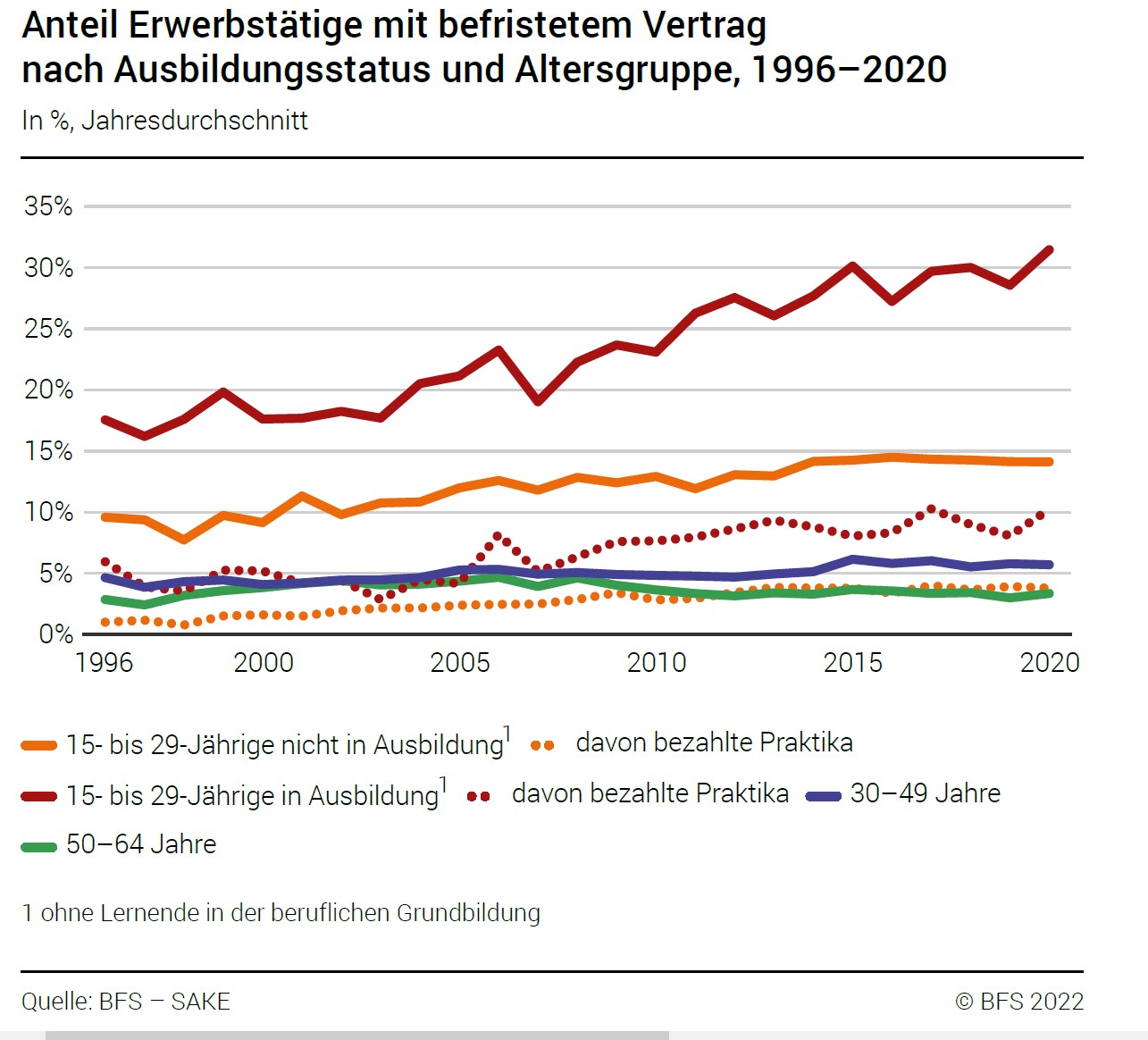 Nahezu jede dritte (31.5%) erwerbstätige Person in Ausbildung (ohne Lernende) im Alter zwischen 15 und 29 Jahren hatte 2020 einen befristeten Arbeitsvertrag. Dieser Anteil ist deutlich höher als noch 1996 (17.6%). Bei den gleichaltrigen Erwerbstätigen, die nicht in Ausbildung sind, stieg der Anteil der befristeten Verträge in der gleichen Zeitspanne von 9.6% auf 14.1%.