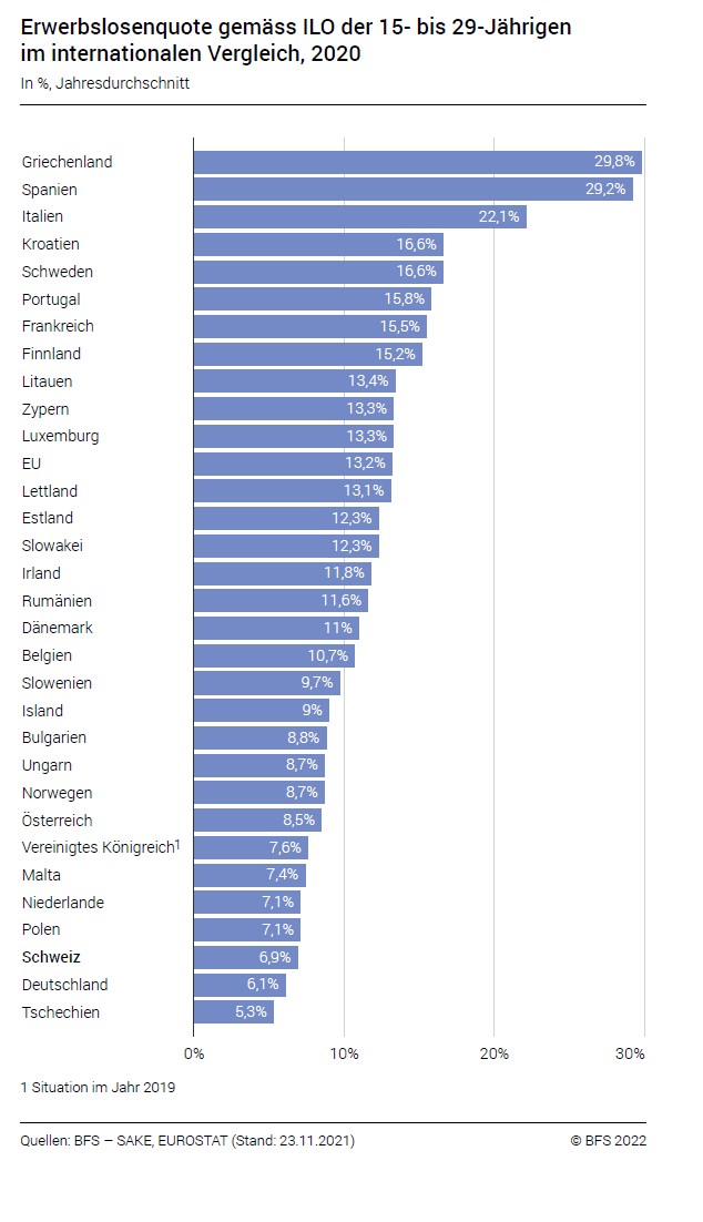Im Jahr 2020 waren in der Schweiz 74 400 Personen im Alter von 15 bis 29 Jahren erwerbslos gemäss ILO. Dies entspricht 6.9% der Erwerbsbevölkerung in dieser Altersgruppe. In der EU ist der entsprechende Wert nahezu doppelt so hoch (13.2%).