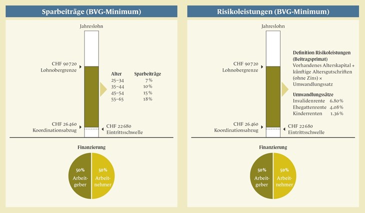 Das BVG-Minimum (siehe Grafik) dient heute vor allem als rechtlicher Rahmen und Orientierungsgrösse. Kaum ein verantwortungsvoller Arbeitgeber beschränkt sich in der Praxis darauf. Insbesondere bei den Risikoleistungen ist dies aus sozialer und reputationsbezogener Sicht nicht mehr vertretbar.