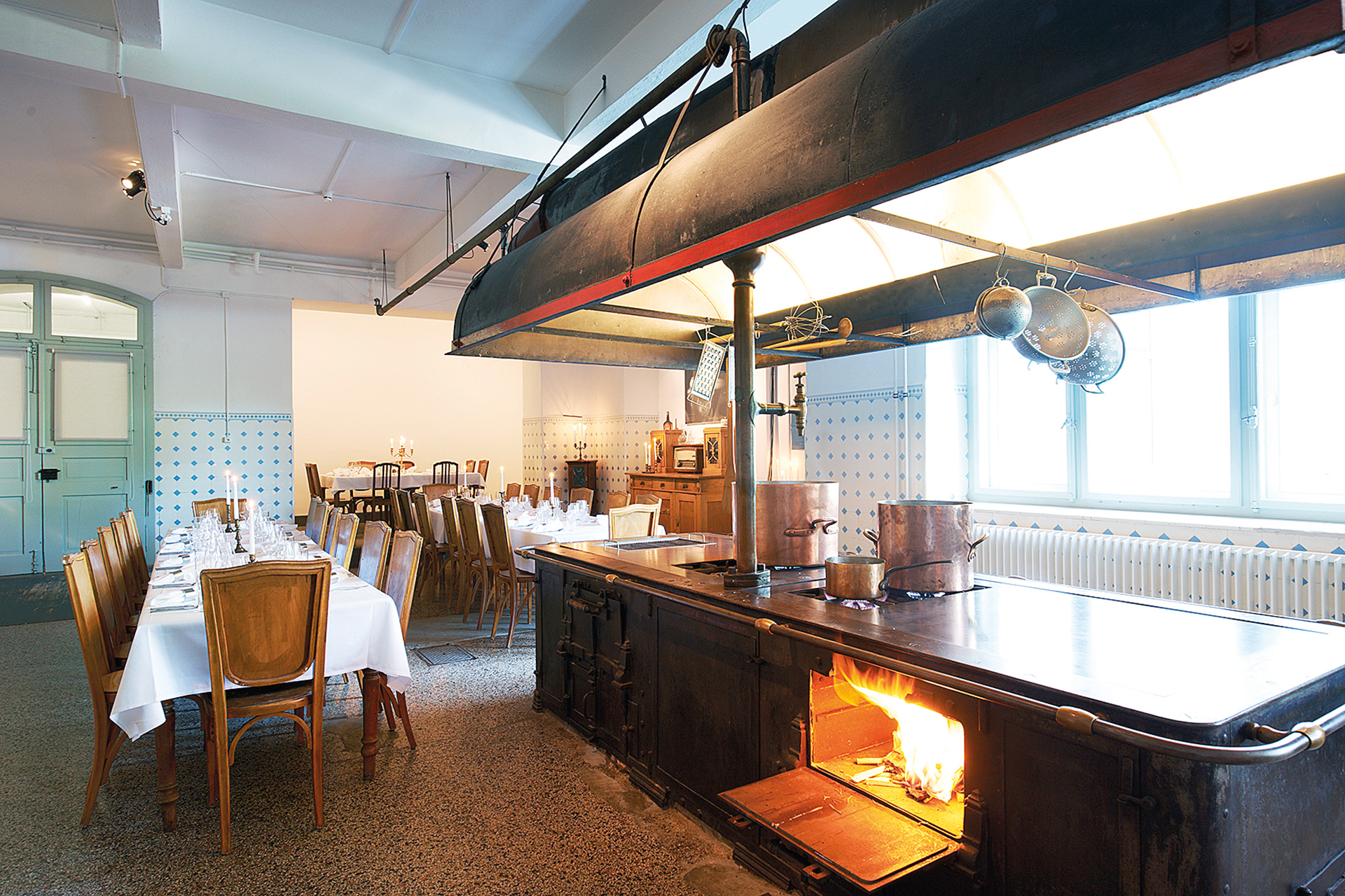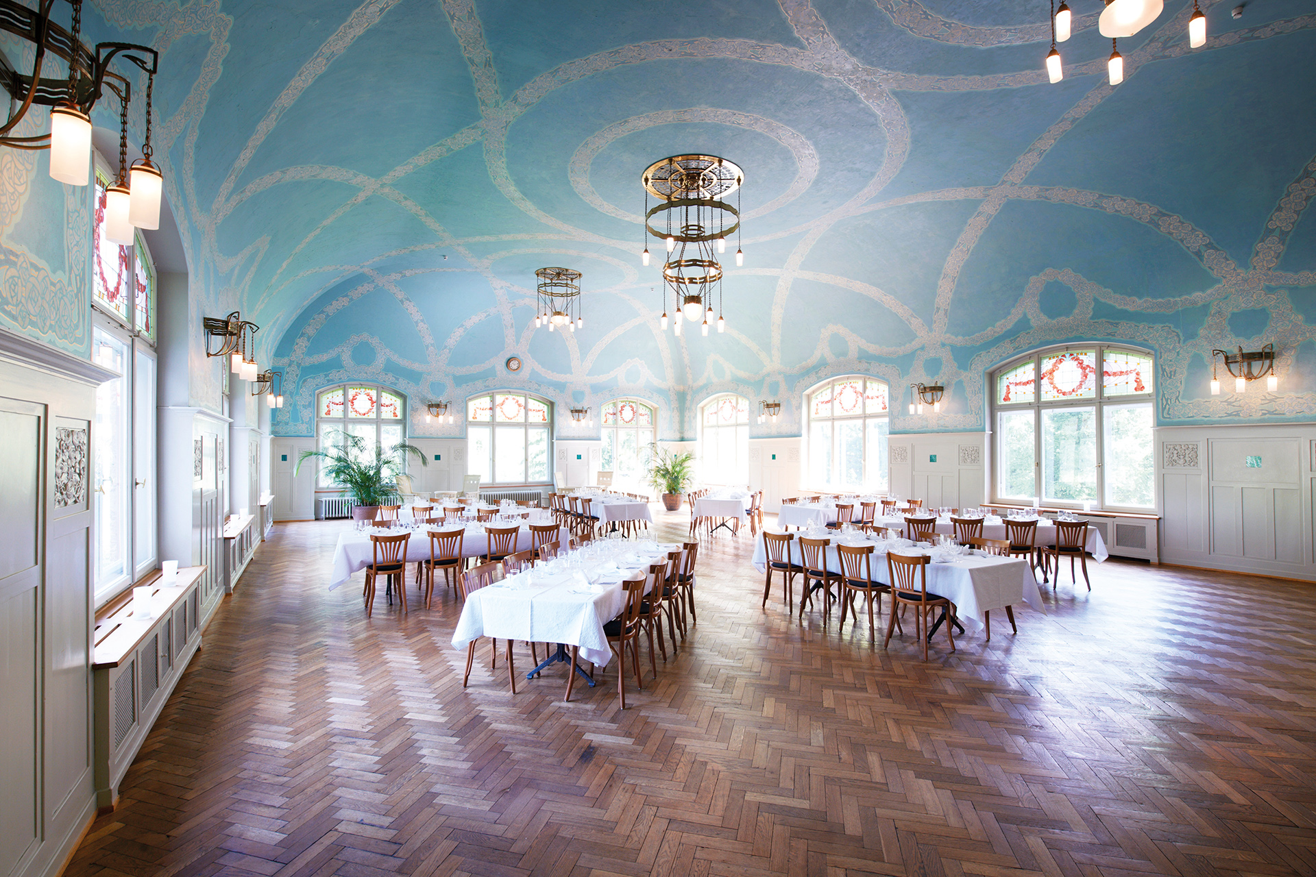 (CHF 275.00/Tag) im Erdgeschoss eröffnet auf 60 m2 Raum für Präsentationen für bis zu 30 Personen. Die sorgfältig renovierte Alte Küche (CHF 275.00/Tag) bietet auf 80 m2 ein einmaliges Ambiente für inspirierende Workshops oder kulinarische Team-Building-Events für bis zu 25 Personen. Der prachtvolle Jugendstilsaal (CHF 550.00/Tag) macht die Geschichte des Hauses erfahrbar und schafft auf 230 m2 einen zauberhaften Rahmen für Events für bis zu 130 Personen. Weitere Gruppenräume für jeweils bis zu acht Personen sind im Haus verteilt (CHF 50.00/Tag), während sich das Foyer, die Terrasse und der Park für Gruppenarbeiten empfehlen.
