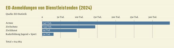 Im Jahr 2024 wurden von den Dienststellen rund 615000 Anträge eingereicht, wobei über die Hälfte auf die Armee entfiel (siehe Grafik). An zweiter Stelle folgt der Zivilschutz mit rund 144000 Anmeldungen.